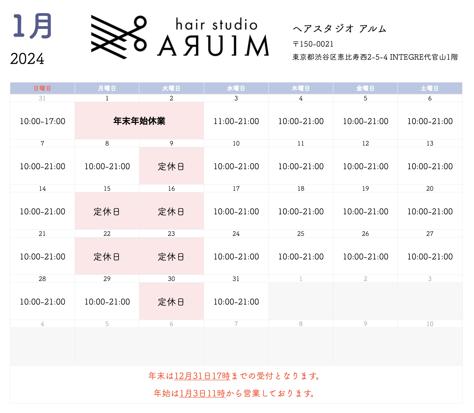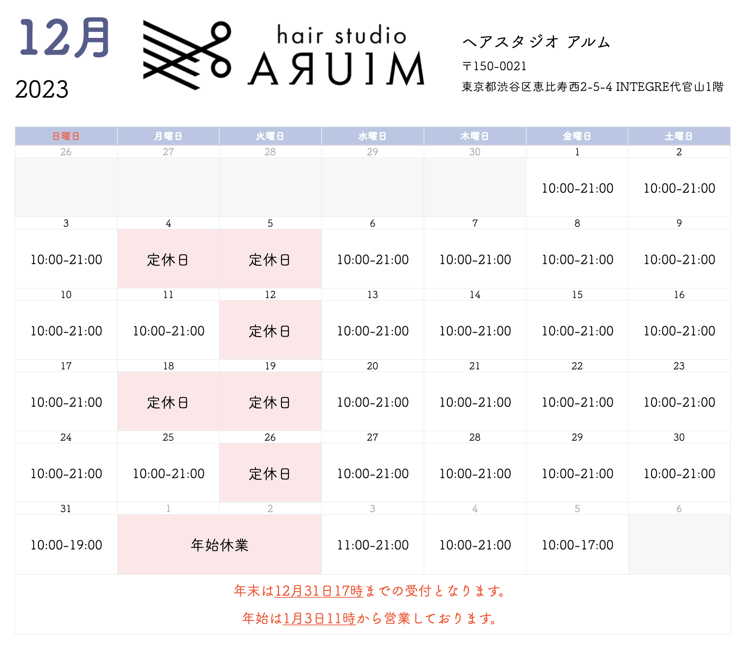 12月、1月、年末年始営業日のご案内【代官山、恵比寿の理容室hair studio ARUIM】