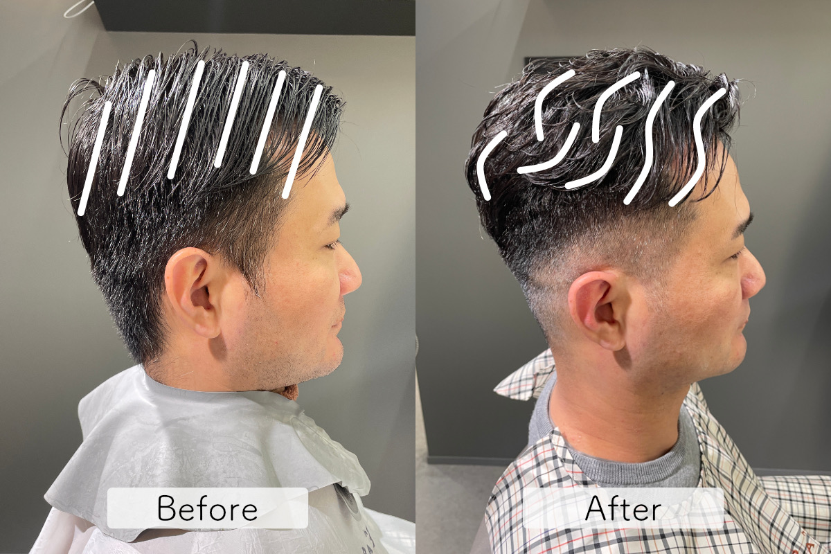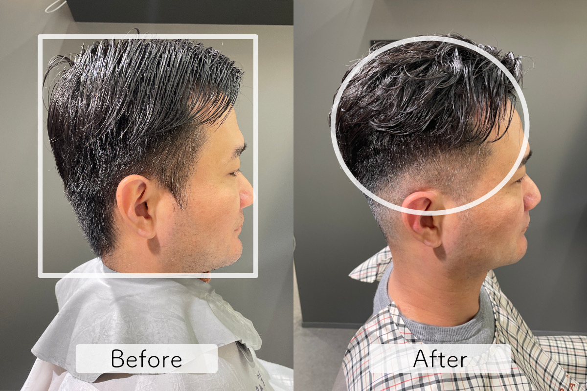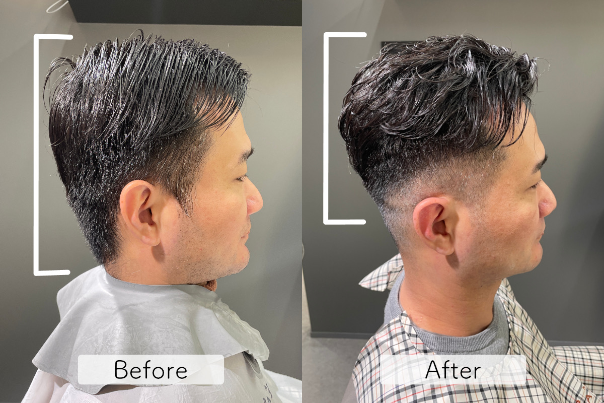 今回は横と後ろをフェードカットにすることで、グッと縦の長さを縮めています。